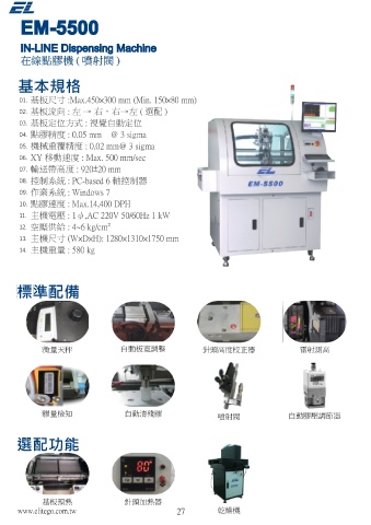標準配備 • 雷射自動測高、膠量自動檢知、自動清殘膠、基準點校正、天秤膠量檢測。